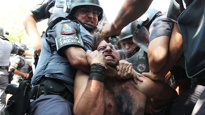 Brazilian police spraying immobilized civillian. Photo by Robson Fernandes.